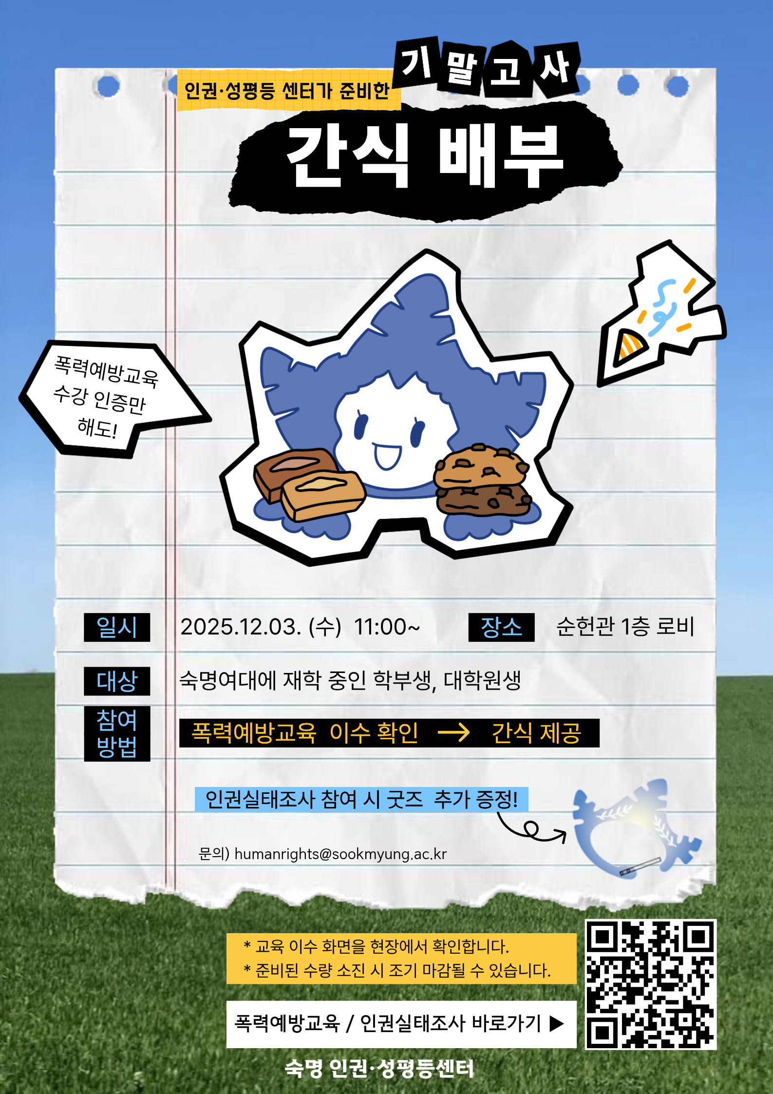 인권·성평등센터에서 '폭력예방교육 이수 독려'를 위해 간식 배부를 진행합니다!